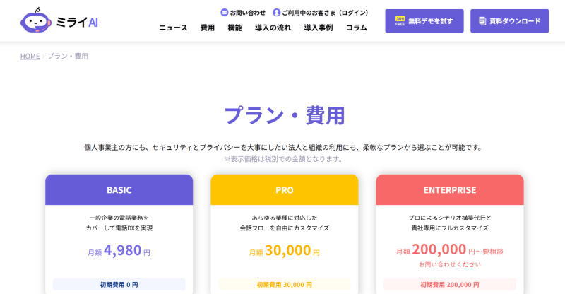 | ミライAI | BASIC 月額4,980円〜 | 要確認 | オフィス電話の取次、自社フロー設計 |
