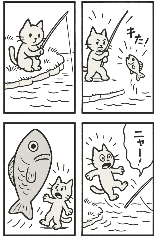 3. コマ3(転換)釣り上げた魚が意外にも超巨大で、猫が驚いて後ろにのけぞる。