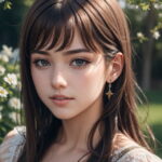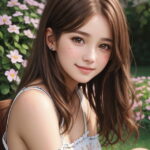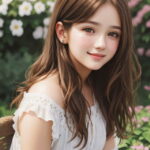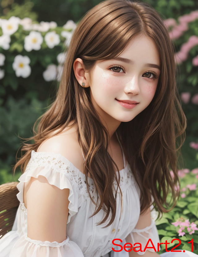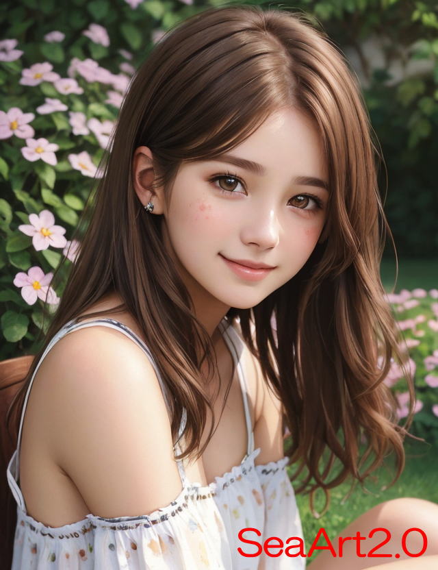 Prompt:A very beone girl, small smile cute eyes, beautiful 18 year old girl, beautiful watercolor, shoulder length disheveled brown hair, clean detailed face, sitting in the garden, ((super detailed Face)), bright brown hair, beautiful image, gentle pose, high image quality, high definition, ((close-up))autiful woman in her 20s