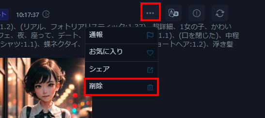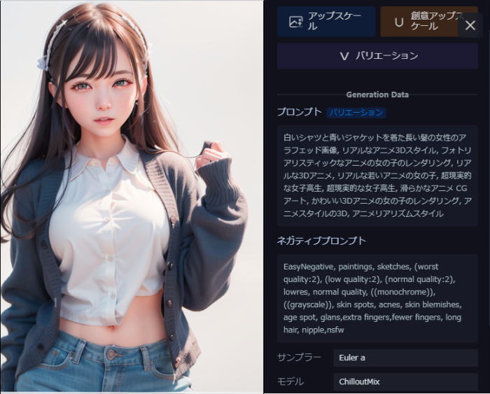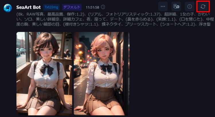 プロンプトと設定を確認後、「生成」ボタンをクリックします。数秒〜数十秒で画像が生成され、ダウンロードや共有が可能になります。