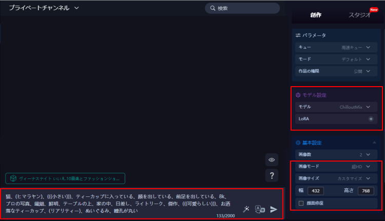 テキストボックスに生成したい画像の説明を入力し、スタイルやモデルを選択します。必要に応じて、画像サイズやステップ数などの詳細設定も行えます。
