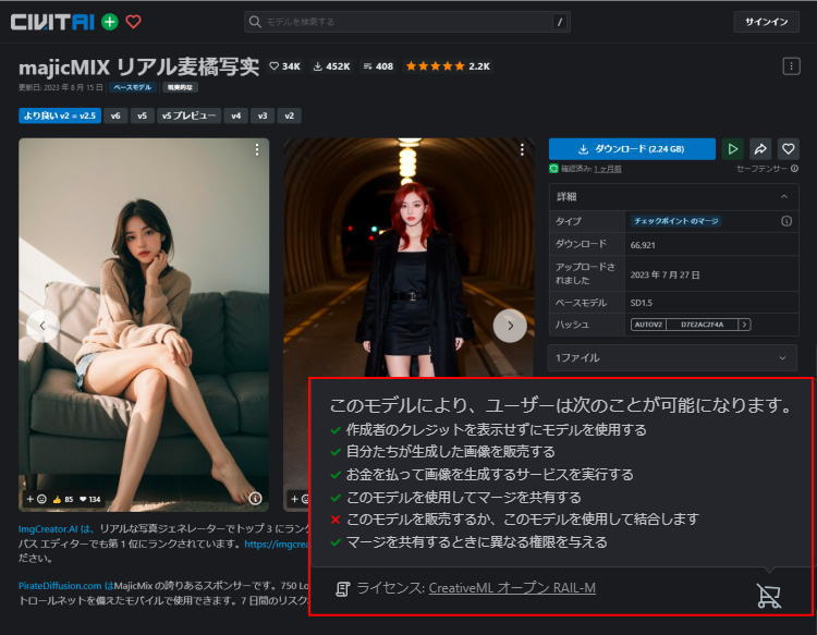 では、「majicMIX realistic 麦橘写实」モデル詳細ページからcivitaiのリンクをクリックすると、civitaiの「majicMIX realistic 麦橘写实」詳細ページに移動します。そのページには、モデルの著作権が記載されています。