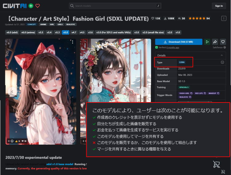 【Character / Art Style】Fashion Girlのライセンスを見てみましょう。civitaiで配布されています。